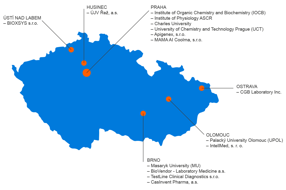 We have re-structuralized the research teams and individual projects according to current needs. In particular, projects involving bioinformatics, laboratory informatics, artificial intelligence, telemedicine and molecular imaging and tracing were included to address market and society needs. New rules also enable direct participation of small, medium and large enterprises, which empowers even closer collaboration and joint research. As illustrated in Figure 1, research activites are concentrated around Prague, Brno and Olomouc regions, known to actively pursuing biomedical research. Project strategic outlook and prospects in the field are summarized below.